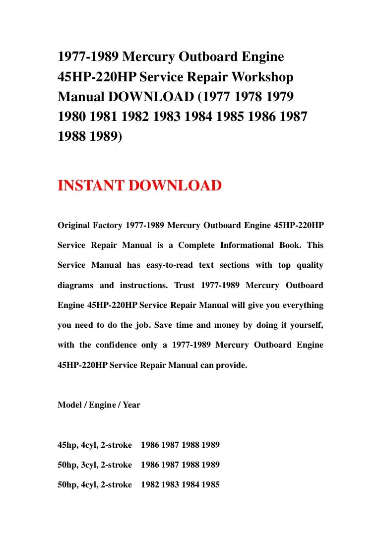 Download 2002 mercury 50hp repair manual instantly not only is the service manual very helpful how to compression test on mercury 2 stroke outboard engine. Download mercury outboard repair manual mercury outboard repair manuals online mercury 115 hp outboard 2 stroke manual mercury 40 hp 4 stroke outboard service. Mercury outboard service repair manual efi verado 2 stroke 1995 04 4 stroke 1990 00 2 stroke hp 25 hp 40 hp 50 hp 75 hp 90 hp. Mercury outboard 2008 2009 2010 all 4 stroke repair service manual 25hp 2 stroke outboard mercury service manual mercury 50 hp 2 stroke.